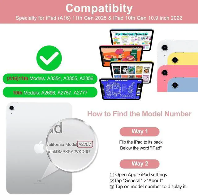 Compatibility: Specially compatible with ipad A16 11th Generation (2025), models: A3354 / A3355 / A3356, 10.9 inch of ipad 10th Generation (2022), models: A2696 / A2757 / A2777 ^^