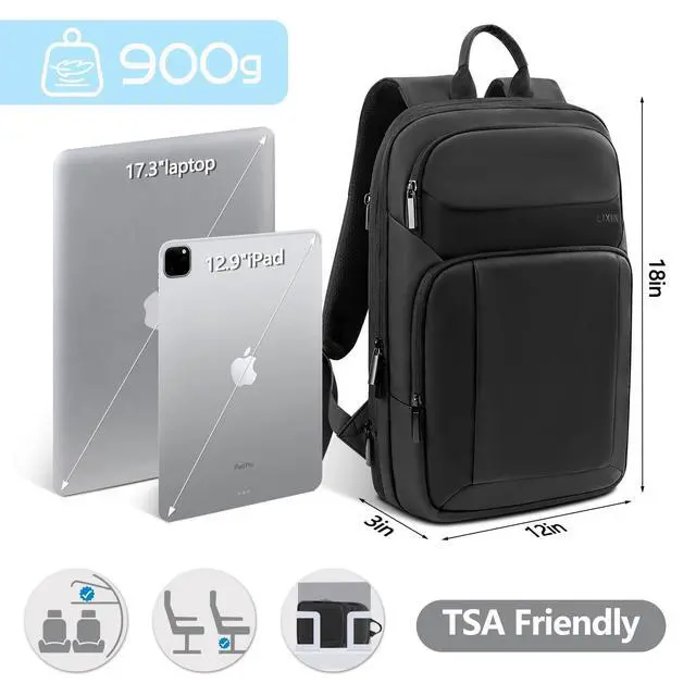 Expandable & Large CapacityThis travel laptop backpack for men fits most 17.3 inch laptops. The work backpack for men weigh only 900g (2 lbs), The computer backpack capacity can be expanded from 15 liters to 25 liters. The standard size18 x 12 x 3 inch. Ideal for work, commute or college. The expanded size18 x 12 x 7 inch. Ideal for travel, vacation or business. This casual lightweight backpack suitable for any occasion. ^^ USB Charging PortThis business backpack for men features a built-in USB charging port, allowing you to conveniently charge your devices on the goperfect for business trips or vacations (power bank is not included).