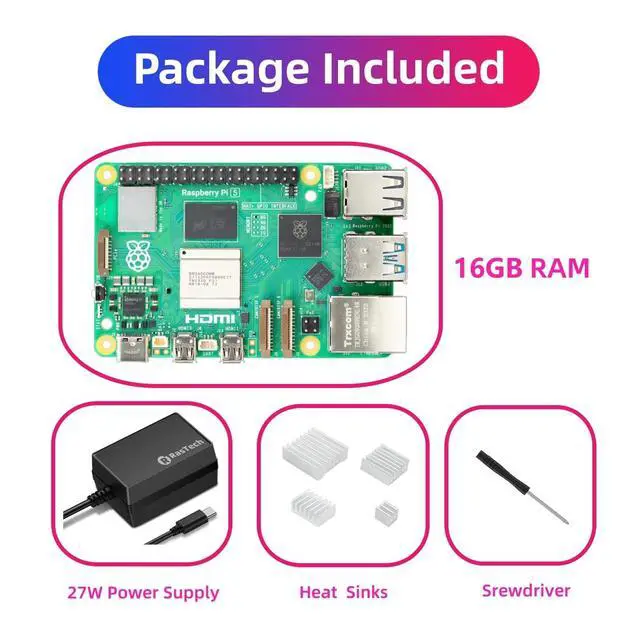 Get: 1*Raspberry Pi 5 16gb RAM single board. 1*27W 5.1V 5A GaN power supply. 4*Aluminum Heatsinks. 1*Screwdriver. 12-month free warranty, lifetime service, 24-hour prompt and friendly response. ^^ Faster CPU, Better
