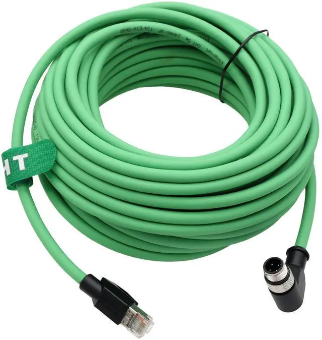 Ethernet M12 D-coded 4 pin to RJ45 connector network data power CAT5E cable, 15 meter / 49.2 feet. The screw-locking M12 connector is male right-angle 315-degree ^^ M12 Ethernet cable for SICK sensor, for Keyence IV IV2 series sensor / SR-1000 2000 700 750 barcode reader, for Datalogic barcode scanner Matrix 120 210N 300N 410N 450 DS2100N DS2400N DS5110, for Omron machine vision system to network communication application like PC host computer PLC router switches, PoE injector rated at 30V 3A ^^ M12 cable is widely used in sensor, machine vision image sensor camera system, barcode scanner reader, actuator, encoder, industrial Ethernet, network, outdoor LED display, rail transit CCTV control system, industrial automation control, servo, motor, robot, fieldbus, EtherNet/IP, profinet, EtherCAT, switches, router, PC host computers, PLC, process control, PoE injector power ^^ The cable can effectively avoid electromagnetic interference signals, and can transmit data high speed and stability, up to 100 Mbit/s.