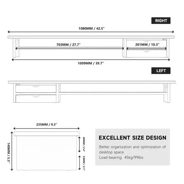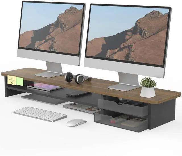 Space-Saving Design: Dual monitor riser is 42.5"L x 9.3"W x 5.5"H, this laptop riser is big enough to support two monitors. 2-tier desktop organizer and two semi-transparent frosted acrylic drawers to keep your workspace organized ^^