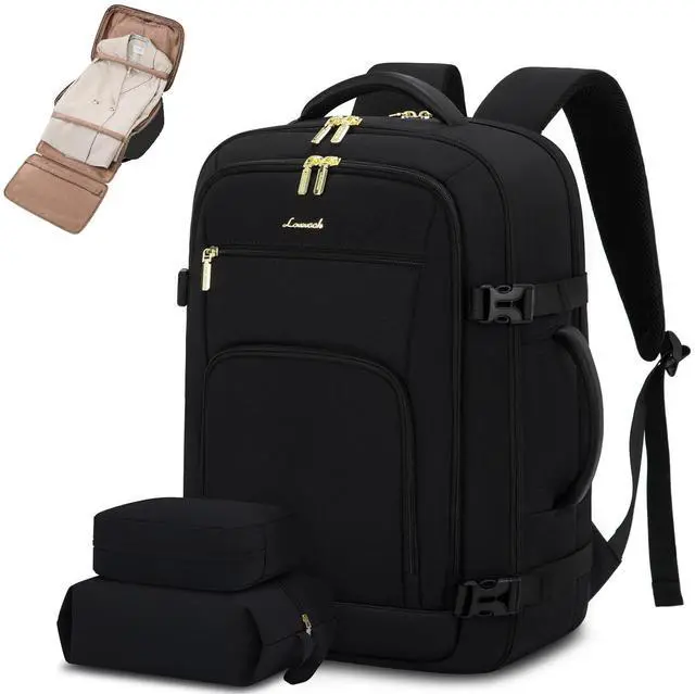 LOVEVOOK Travel Backpack for Women, 50L Carry On Backpack Flight Approved with Garment Bag, TSA Personal Item Travel Bag Fit 17 Inch Laptop, Business Weekender Waterproof Daypack With 2 Cubes, Black