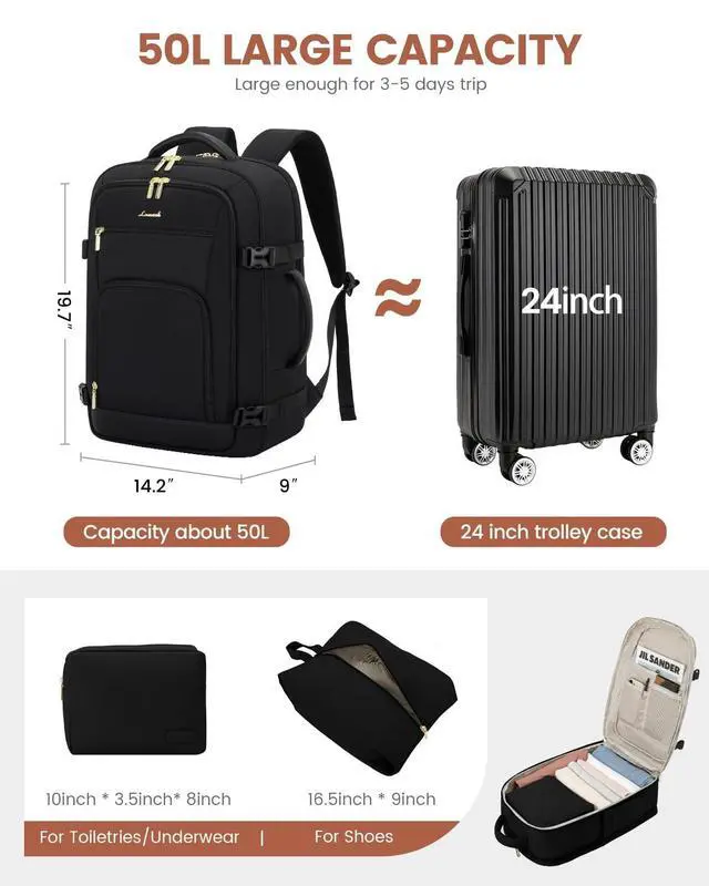 DescriptionLOVEVOOK Large Travel Backpack for Women & Men, 40L Carry on Backpack for Airplanes, TSA Personal Item Travel Bag fits 17" Laptop, Waterproof Travel Essentials Airline Approved with 19 Packing Cubes