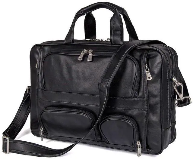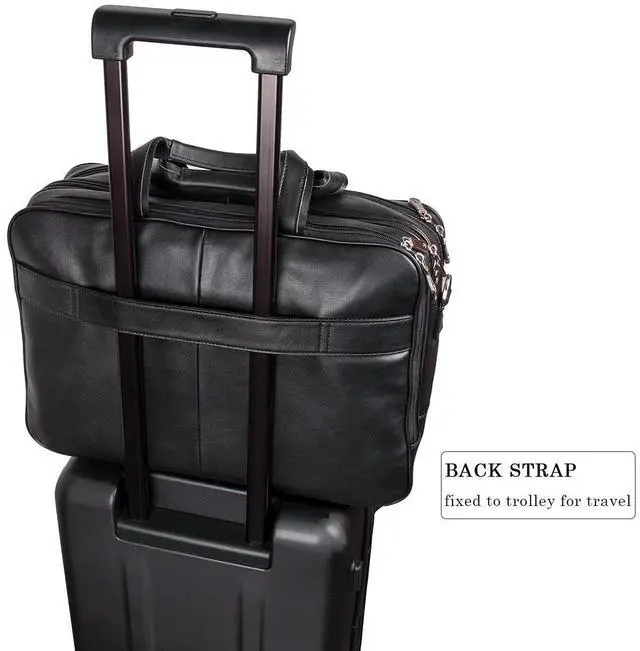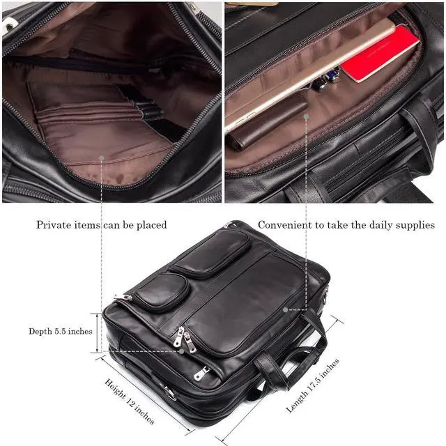 ^^ Capacity: three zippered pockets in front, can fit your small belongings, three zippered pockets at the top, middle compartment fit up to 17.3" Laptop, padded laptop compartment fit 16" Laptop, other two compartments can hold, for example, PAD, books, glasses, phone, wallet and clothes for short trips; this leather briefcase with large capacity for all your business needs.