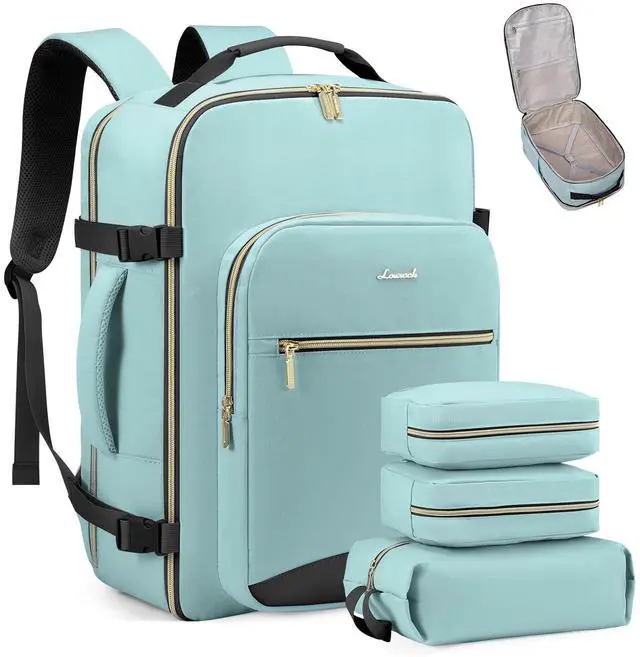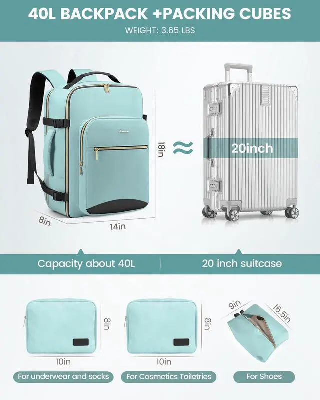 LOVEVOOK Travel Backpack for Women & Men 40L,Airline Approved Carry On Backpack Travel Essentials,TSA Carry on Luggage,Waterproof Personal Item Travel Bag,Suitcase with 3 Packing Cube,Mint green-Black