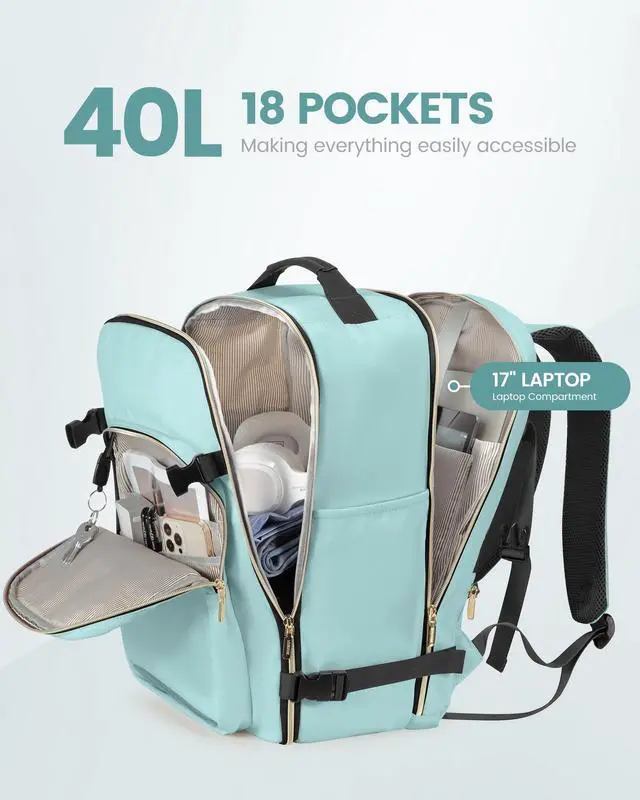 Large Capacity & Multiple Pockets: The travel backpack has a 40L large capacity and 4 main compartments, which can meet daily and travel needs. The travel backpack for women's main compartment can store a lot of things, including 5-8 pieces of clothing, shoes, books, and many other items. The separate laptop compartment is padded with EVA foam to provide the best protection for your 17" laptop and 12.9" iPad. The front compartment has many pockets to keep your belongings organized. ^^