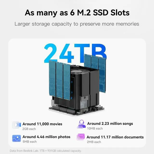 High capacity storageThe Beelink Me Mini NAS comes with 6 M. 2 NVMe SSD slots (supporting 2230/2242/2280), each slot supporting up to 4TB capacity, for a total of up to 24TB capacity. This will enable the machine to store approximately 11000 movies, 2.23 million songs, 4.46 million photos, or 11.17 million documents. The 1TB SSD that comes with the machine is installed in the fourth slot (M. 2 PCIe 3.0 x2, compatible with SATA3), and the remaining five slots are M. 2 PCIc 3.0 x1. You can install the SSD yourself and use it to store data.