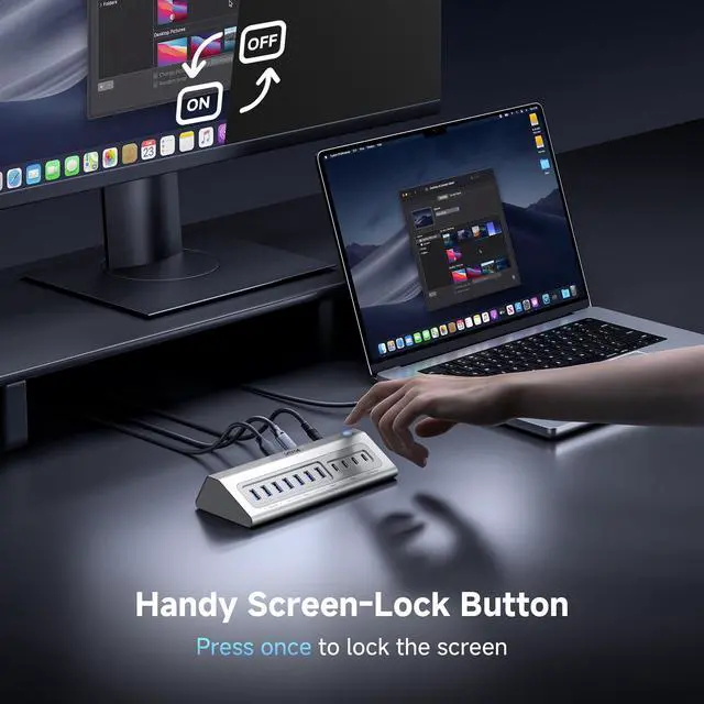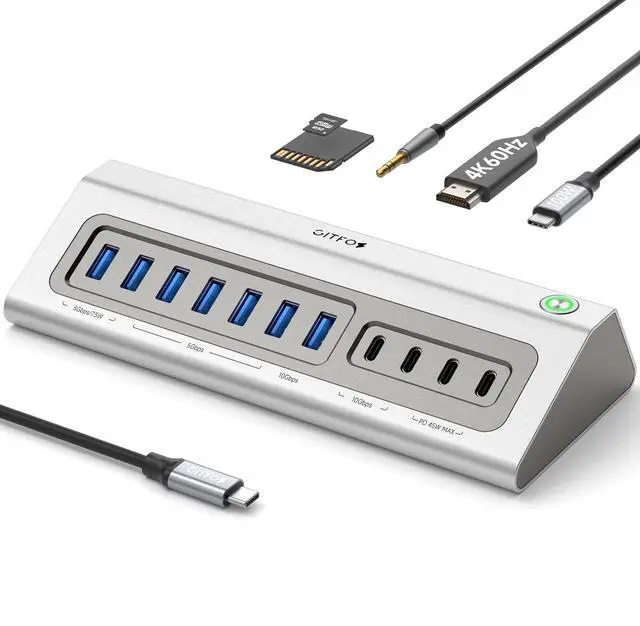 Note: When charging your laptop, please use YOUR original adapter to connect to the USB-C PD port. ^^ Ergonomic Design & Efficient Heat DissipationCrafted from durable aluminum for superior heat dissipation and more stable operation, this powered USB 3.2 hub features a stable, angled trapezoidal ergonomic design. The raised slope ensures easy visibility and connection, while non-slip feet keep it securely placed for a tidy, reliable workspace. Perfect for IT, photographers, video editors, remote workers, creators, and students. ^^ Wide Compatibility & What You GetThe USB multiport adapter works on all devices that are equipped with full-featured USB C ports, which plug and play, No driver installation required to expand your usb c devices' capabilities, such as the MacBook Air/Pro (M1/M2/M3/M4/M5), iMac M4/M3/M1, Mac Mini M4/M2/M1, Dell XPS, and Surface Pro.