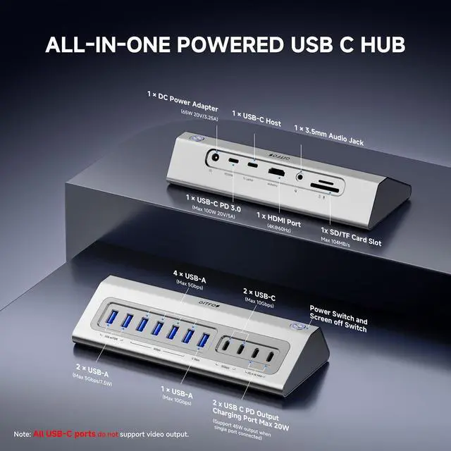 USB C Hub: The USB C Hub multiport adapter is equipped with 1*4K@60Hz HDMI, 1*USB C PD 100W, 2* USBC (Single-Max 45W, Dual-Max 20W) charging ports, 2*USBC 3.2 and 1*USBA 3.2 data ports 10Gbps, 4*USBA 3.0 data ports 5Gbps, 2*USBA 3.0 data 5Gbps or charging 7.5W ports. 1*TF/SD, 1*