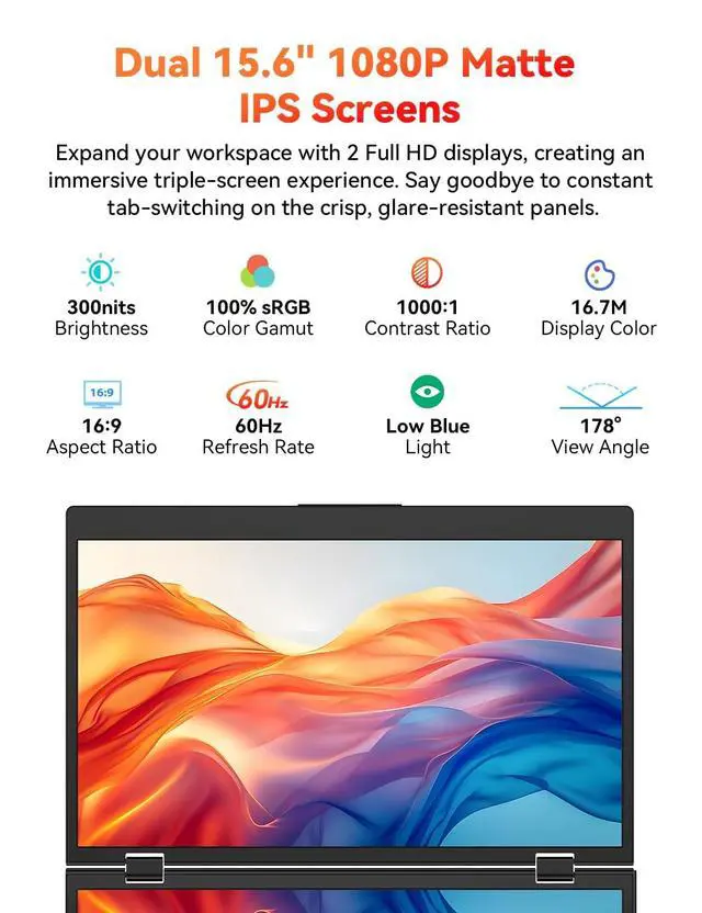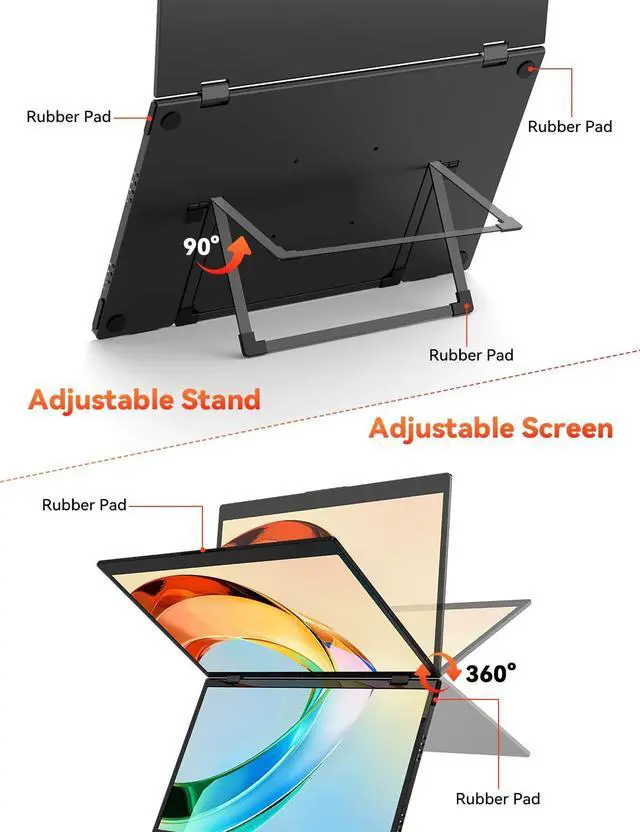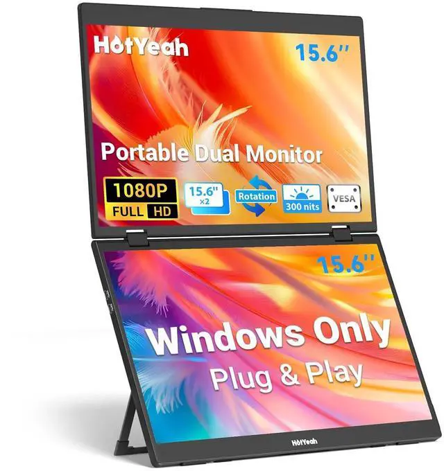 Important Notice: For phones and tablets, it only supports mirror landscape mode, no extended mode ^^ Versatile Foldable Monitor- The 360rotatable upper screen allows you to share the screen with your friends or colleagues in all directions. With a screen rotation button, simply press and flip your laptop screen 180 in face-to-face discussions. With a 3.5 lbs weight and a 3.1 slim metal frame, though this monitor has 2 screens, it can be folded up and carried like a laptop, portable for trips. Support extend/mirror/splice/portrait/shared modes and bring your perfect multi-screen display experience. ^^ Staked Ergonomic Design- With a built-in 90 adjustable kickstand, you can freely adjust the dual monitor to any comfortable angle. VESA holes (75*75mm) on the back support allow you to mount this triple monitor to a wall or desktop monitor arm. Unlike other dual screens, its vertical opening saves you more space and enables your 3-screen work area even in a small space or while traveling. The vertical design greatly reduces the swings of your neck and head from side to side. ^^ 1080P FHD Screen Extender- With two stacked 15.6 IPS LCD matte panels, HotYeah dual portable laptop monitor offers you 178view angle, 300nits brightness, 100% sRGB color gamut, and 1:1000 contrast ratio, bringing you a more true-to-life picture and a larger 23.8 visual space.