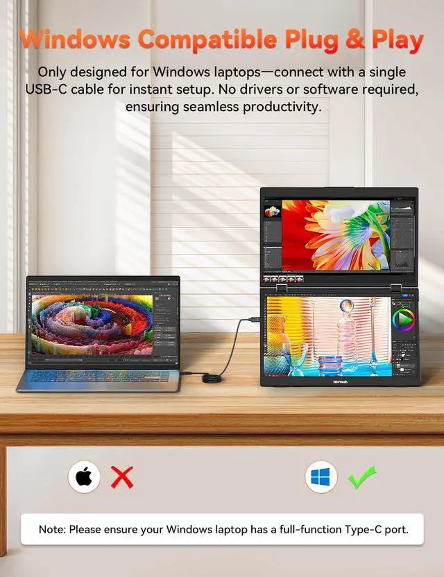Only for Windows System- HotYeah triple monitor is only designed for the Windows system. You can easily get a 3-screen workstation with a single USB-C cable once your Windows laptop comes with a full-function Type-C port. Also, each screen of this portable monitor can be independently adjusted, such as its brightness, RGB, etc. If youre a loyal user of the Windows system, this display is your ideal cost-effective choice. If youre confused about if your laptop is compatible, please feel free to consult us. ^^ True Plug And Play- No driver or app is needed, and no complex setup is required.