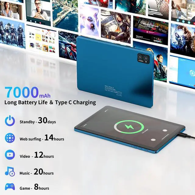 Crisp Visuals: Immerse yourself in vibrant colors and solid clarity with the 10.1 -inch 1280x800 IPS display. Whether you're enjoying HD videos, video calling with family, or reading eBooks, the screen delivers a comfortable viewing experience. Adjustable brightness and optional large-font mode make it accessible for all agesideal for casual home and school use ^^ Long-Lasting 7000mAh Battery for
