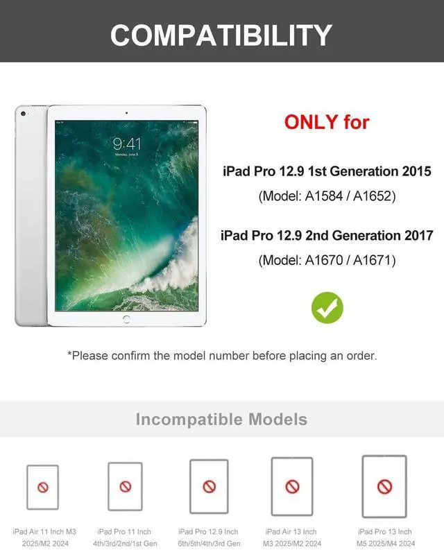Generation(model: A1670/A1671/A1584/A1652). Not fit any other models. Please confirm your tablet model before purchasing. Easy of UseTransform your tablet into a powerful productivity tool with our tablet keyboard case for 1st pro 12.9. This teclado for ipad pro 12.9 offers a seamless typing experience. Keyboard FunctionallyMagnetically detachable super slim 7mm and light weight bluetooth keyboard with 10M range. And the book cover for 2nd pro 12.9 keyboard with strong magnetic keyboard gives you a stable platform for typing that won't move easily. Rechargeable BatteryBuilt-in rechargeable battery for long keyboard life. For 2015 pro 12.9 inch keypad case ensures your device is always ready for action, thanks to its auto wake/sleep function. Precise CutoutsPrecise cutout allows full access to all ports, user interface, sensors, speakers, microphone and cameras. Multiple Viewing AnglesThis magic keyboard for 2017 pro 12.9 inch has 3 grooves to adjust the viewing angle as you like, make your tablet stand steadily. Perfect for working, writing, reading or watching videos. 360 Protection for TabletFor ipad pro 12.9 A1652 case keyboard features a sturdy high-quality PU shell and soft anti slip rubber lining inside, providing comprehensive protection for your tablet.