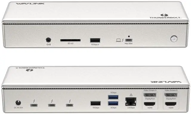 15-in-1 Thunderbolt 4 Dock Features a comprehensive range of ports, including 1x Upstream Thunderbolt 4 Port (40Gb/s, 98W), 1x Power adapter, 3x Downstream Thunderbolt 4 Ports (40Gb/s; PD15W; 8K), 1x RJ45 Ethernet ( 2.5G bps), and 2x Video Stream (4K DP+ 4K HDMI), 1x Audio, 1x SD Card Slot (312MB/s), 2x USB-A 10Gbps+2x USB-A 5Gbps. Connect all your essential peripherals with ease.