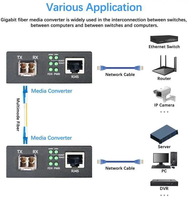 What's Included: 2pcs Gigabit Fiber Ethernet Media Converter; 2pcs SFP Dual LC Multi-Mode Transceiver; 2pcs 5V 1A Power Supply, 100V-240V; 1 x User's Manual. Can be used in multiple work environments, such as home, business, security monitoring systems, campus networks, and more.