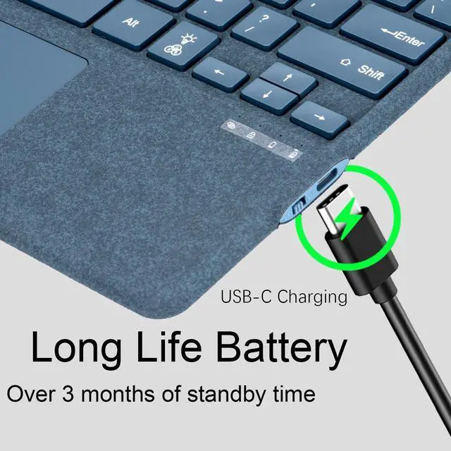 • Type-C charging port: Charge keyboard externally with USB cable included. (NOT charged via magnetic attach). Equipped with 7-color LED backlight and 3 adjustable brightness options. Ultra thin and lightweight, easy to carry.