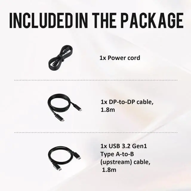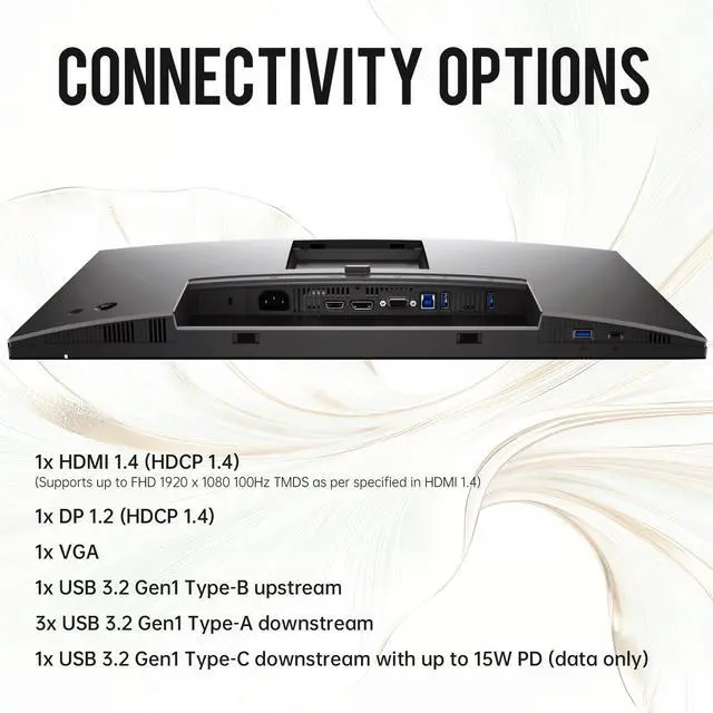 1x HDMI 1.4 (HDCP 1.4 ) (Supports up to FHD 1920 x 1080 100Hz TMDS as per specified in HDMI 1.4 ) 1x DP 1.2 (HDCP 1.4 ) 1x VGA 1x USB 3.2 Gen1 Type-B upstream 3x USB 3.2 Gen1 Type-A downstream 1x USB 3.2 Gen1 Type-C downstream with up to 15W PD (data only) ^^ 1x Power cord 1x DP-to-DP cable, 1.8 m 1x USB 3.2 Gen1 Type A-to-B (upstream) cable, 1.8 m ^^ 100Hz refresh rate delivers less flicker, more seamless scrolling, and smoother motion. ^^ Vibrant colors across wide viewing angles enabled by In-Plane Switching (IPS) technology.