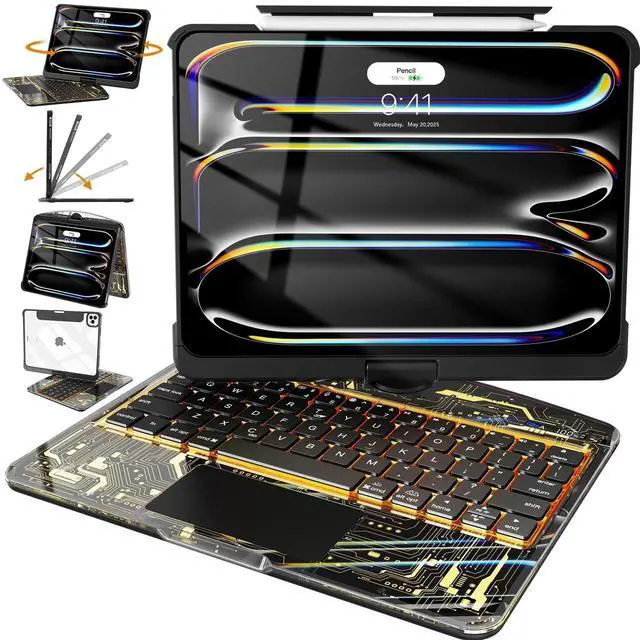 Designed for Specific Model Compatible with iPad Pro 11" M4 2024 only. Not for any other iPad models. Check and confirm model before purchase. ^^ Clear Shockproof Shell Clear back showcases iPad logo. Soft TPU edges with 4-corner airbags offer protective, cyberpunk-style design. ^^ Swivel Adjustable Stand 360 rotatable hinge and 180 fold support laptop, tablet, tent, and presentation modes with versatile viewing angles. ^^ 7-Color Backlit Silent Keyboard Magnetic, detachable keyboard with scissor-switch keys for quiet typing. Customize with 7 colors and 3 brightness levels. ^^ Multi-Touch Trackpad & Indicator Supports swipe, pinch, scroll gestures for precise navigation.