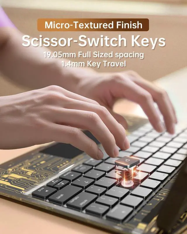 • Multi-Touch Trackpad & Indicator Supports swipe, pinch, scroll gestures for precise navigation. Display shows battery, Bluetooth, Caps Lock status.