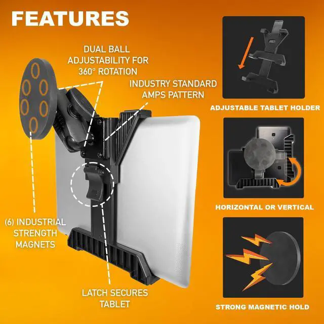 The universal tablet holder adjusts from 4 to 8 wide, fitting tablets from 7 to 11 in screen size, including most device-and-case combinations. Designed for material handling professionals, the MagDock 360 is the ideal solution for mounting tablets on forklifts, pallet jacks, stationary vehicles, workstations, or any other magnetic surface in demanding environments.
