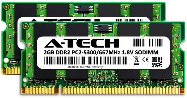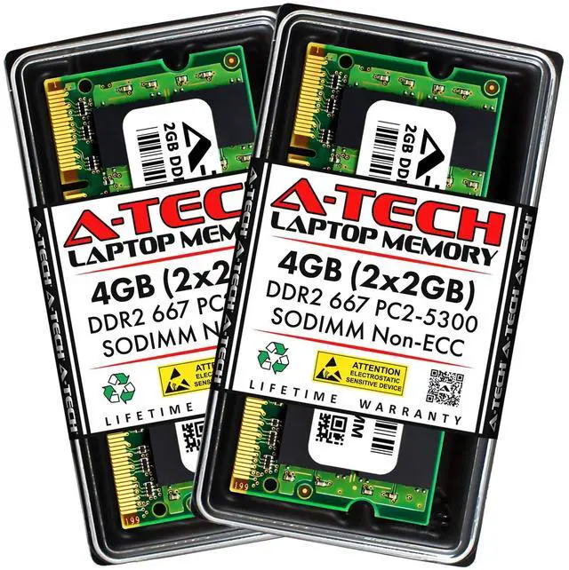 4GB Kit ( 2x 2GB Modules ) ^^ DDR2 667 MHz ( PC2-5300 / PC2-5300S ) ^^ DDR2 SO-DIMM ( 200-Pin ) ^^ Non-ECC Unbuffered ^^ High performance Memory RAM upgrade designed for DDR2 SODIMM compatible Laptop, Notebook, & All in One (AIO) computers ^^ Boosts the performance of your system by speeding up loading times, improving system responsiveness, and increasing your system's ability to handle greater workloads ^^ All modules undergo quality assurance testing to ensure dependable and reliable performance ^^ Please verify the supported memory (RAM) specifications of your system prior to purchase to ensure compatibility ^^ A-Tech provides a Lifetime Warranty for all orders & offers complimentary United States based Tech Support before, during, & after your purchase