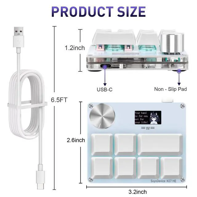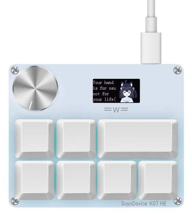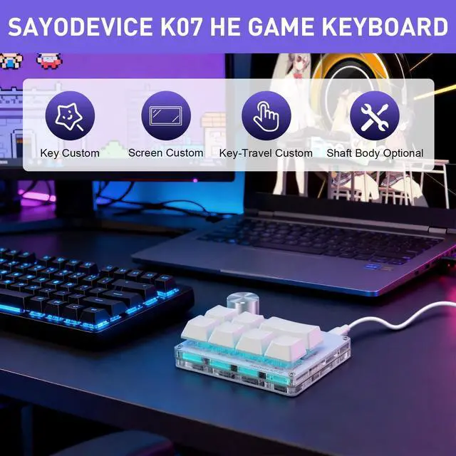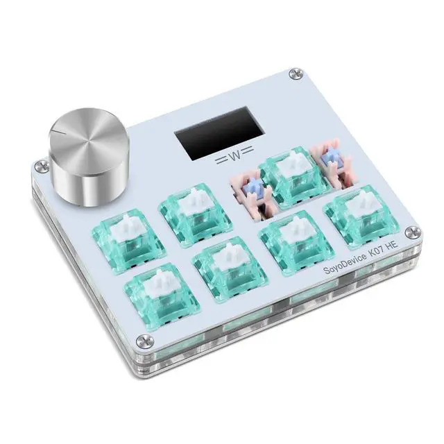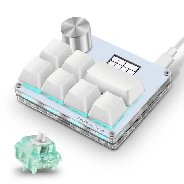 SayoDevice K07-HE KeyboardThis keyboard with 7 Hall magnetic linear switches, 1 knob, 1 screen! TYPE-C, USB 2.0 high-speed 8000HZ. Custom ScreenWith 0.96 inch IPS color screen, 160*80 Resolution, Visible key range and button counting, Support custom animations GIF, 4MB memory capacity. Custom Keys And KnobThe Keys and knob can also be set with any key or ctrl/alt/shift + any keys. Support for mapping game controllers. Custom SwitchesProfessional Game magnetic swithes, Rapid Trigger, 0~ 4.000 mm Custom trigger release. Replaceable Switches3 Swithes available, Supports any hall magnetic switches, Hot-swappable, With a simple click for calibration.