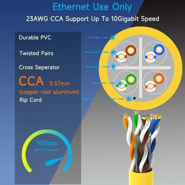 • Ethernet Use OnlyCat 6 cable 1000ft is made of 23AWG super CCA (copper clade aluminum) conductor 0.57mm. By improving the production process, CCA CAT6 cables can achieve the transmission performance of pure copper ethernet cable and save costs. Cat 6 ethernet cables support up to 10G speed 550MHZ.