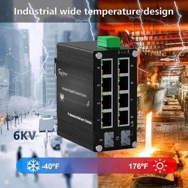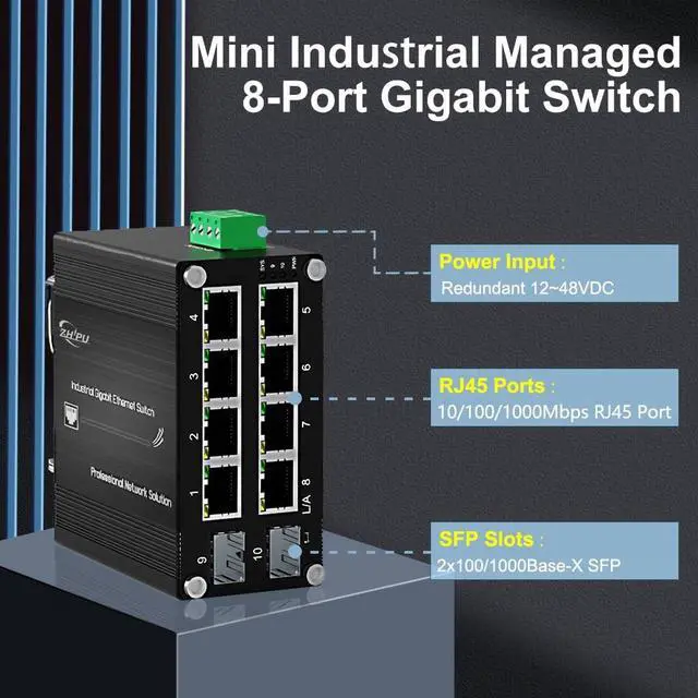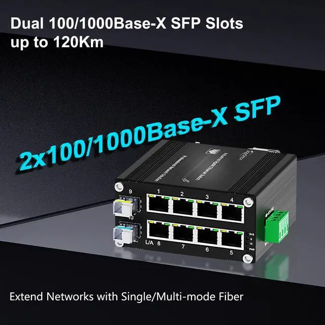[- ]: 8x Gigabit RJ45 + 2x 100/1000Base-X SFP ports, IEEE 802.3 /u/ab/z compliant, ideal for IP cameras, wireless APs, and remote networks.