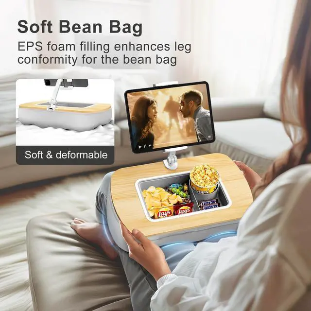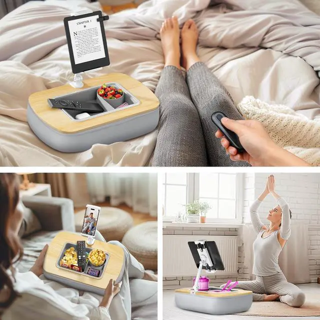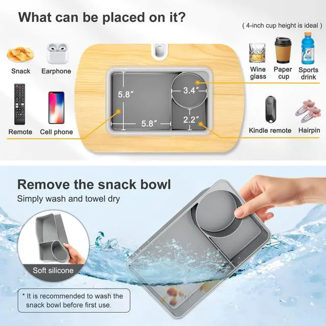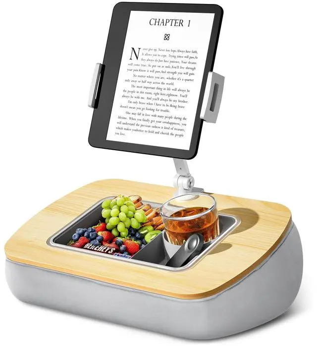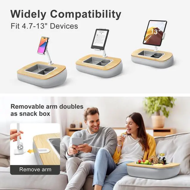 Versatile Support With the arm attached, it securely holds your Kindle, allowing hands-free reading. Remove the arm to convert it into a convenient sofa cup holder. ^^ Comfortable StabilityThe base, filled with polystyrene beads, conforms to uneven surfaces, providing stable support without pressure or discomfort on your lap. ^^ Versatile Storage The removable silicone snack bowl is easy to clean and features three compartments for snacks, drinks, or small items like remotes and glasses. ^^ Adjustable FlexibilityThe detachable tablet arm features dual 180-degree adjustable joints with metal screws and a wrench for easy, precise position and stability adjustments.