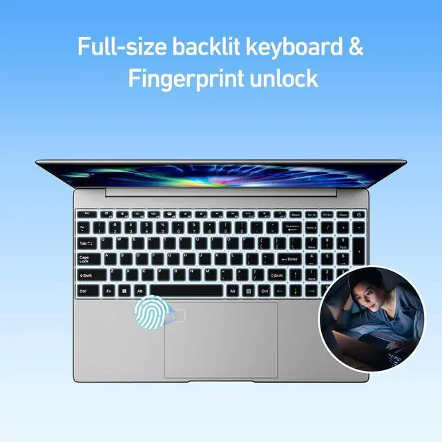 The full-size ergonomic keyboard and large trackpad enhance your typing and navigation experience. ^^ Advanced Features at Your Fingertips - Laptops are equipped with backlit keyboards that allow you to type comfortably in low light or at night. You can adjust the brightness using the FN+F5 keys. The wide and convenient touchpad also adds fingerprint unlocking, which allows you to access your laptop with just a touch of your finger for added security and convenience. There's no need to memorize or enter passwords, making typing and navigation easy and secure.