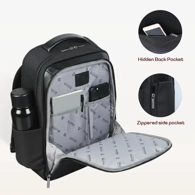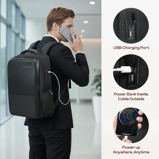 USB Charging Port: Equipped with a built-in USB charging port, this business travel backpack allows convenient on-the-go charging for your phone or devices. Simply connect your power bank inside to stay powered during commuting, meetings, or travel. (Power bank not included) ^^ Secure Back Pocket & Luggage Strap for