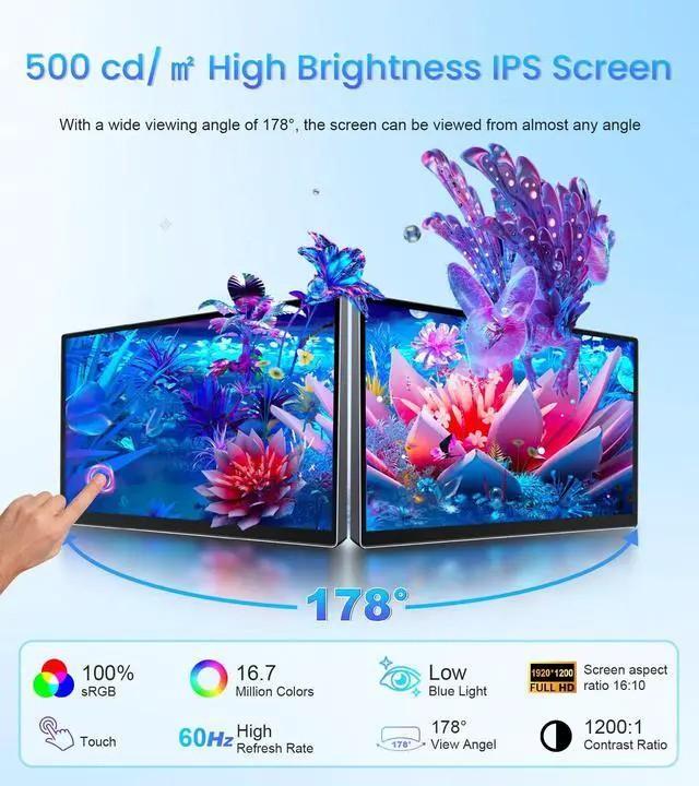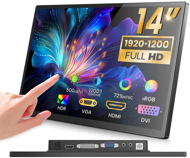 Touscreen Monitor: Features a 14 inch IPS display with 19201200 resolution with a 60Hz refresh rate, 72% NTSC color gamut, and 500cd/m brightness for vivid visuals. The screen has a 16:10 aspect ratio. Its advanced IPS display offers a wide viewing angle of 178, delivering accurate and vibrant colors that are perfect for gaming and watching videos. With blue light reduction and flicker-free technology, no flickering, eye-care. ^^
