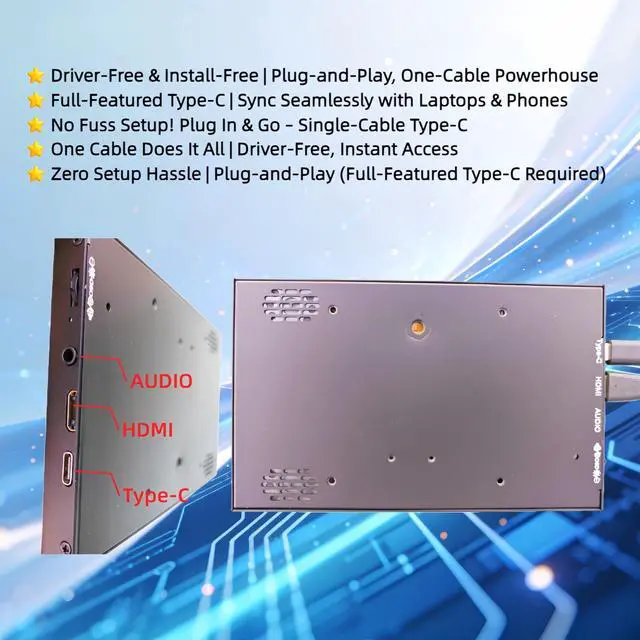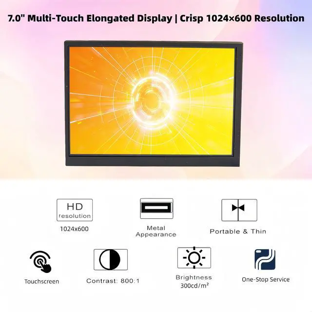 Reminder]: This device has a Type-C port and can only be used with mobile phones/computers that support full-featured Type-C functionality. Otherwise, there may be display abnormalities or no display at all. Typically, only flagship models are equipped with full-featured Type-C ports. **This device does not come with an operating system and supports touch control with Raspberry Pi. ^^ Multi-Touch, Simple Operation Connect the power and data cable for plug-and-play use with no drivers required. Supports multi-touch, two-finger zoom, press-and-drag, and other functions as easy and convenient as using a smartphone. Built-in dual speakers. ^^ Ample Ports, Seamless ExperienceFeatures an all-in-one Type-C cable for simultaneous power and data transfer, plus HDMI, 3.5 mm audio AUX port, and integrated manual controls (volume, brightness, etc. ). And supports various wall-mount installation methods. ^^ Real IPS Technology & 170 Full Viewing Angle FHD IPS bar LCD monitor adopts A+ grade LCD panel, with a 170 full viewing angle and 1024*600 high resolution.