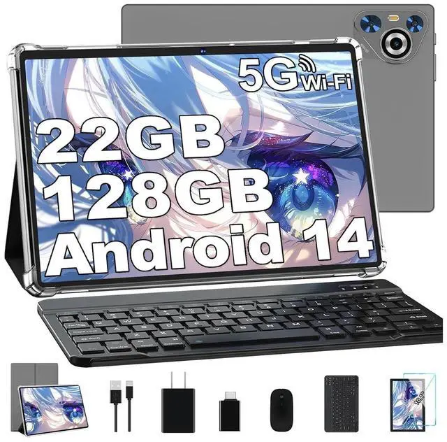 Dghrti 10 Inch Tablet, 22GB RAM+128GB ROM+1TB Expand, Android 14 Tablet with Keyboard and Mouse, 8000mAh Battery, 1280x800 IPS Display, Octa-Core CPU, Support BT5.0, GPS, WiFi - Gray