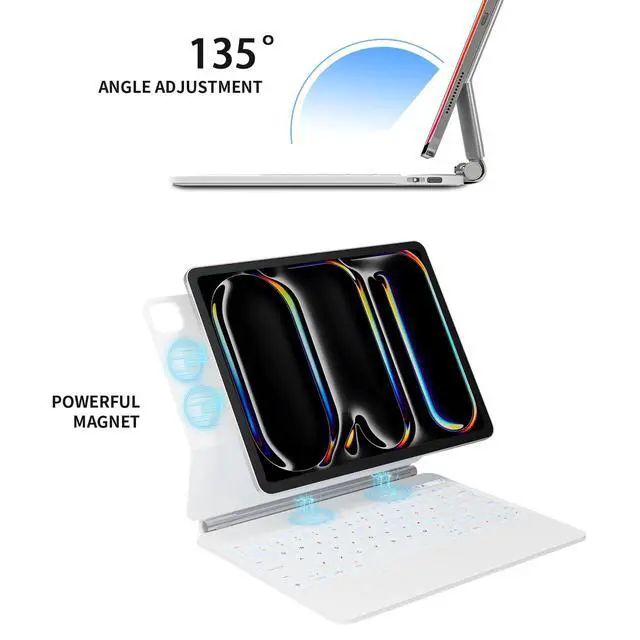 ^^ Floating Cantilever Design: Powerful magnets instantly snap your iPad into perfect alignment. Smoothly adjust the metal hinge from 0 to 135 for any viewing angle. Folds flat into a slim profile toss it in your bag for effortless portability. ^^ LED