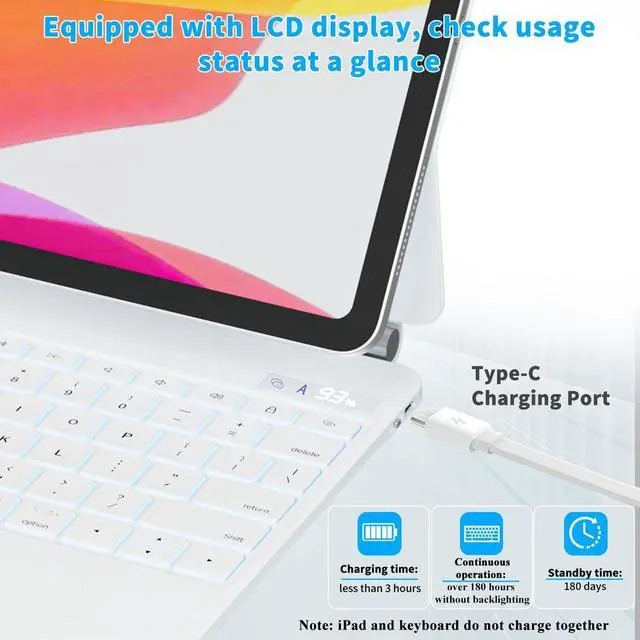 Backlit & LCD Display: Magic Keyboard iPad Pro 13 inch glows in 7 vibrant colors with 3 brightness levels (low, medium, high) and a color-changing "breath" mode. A small LCD screen shows your battery life, if CAPS LOCK is on, and your Bluetooth connection status.