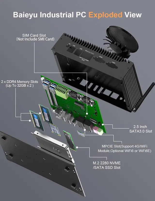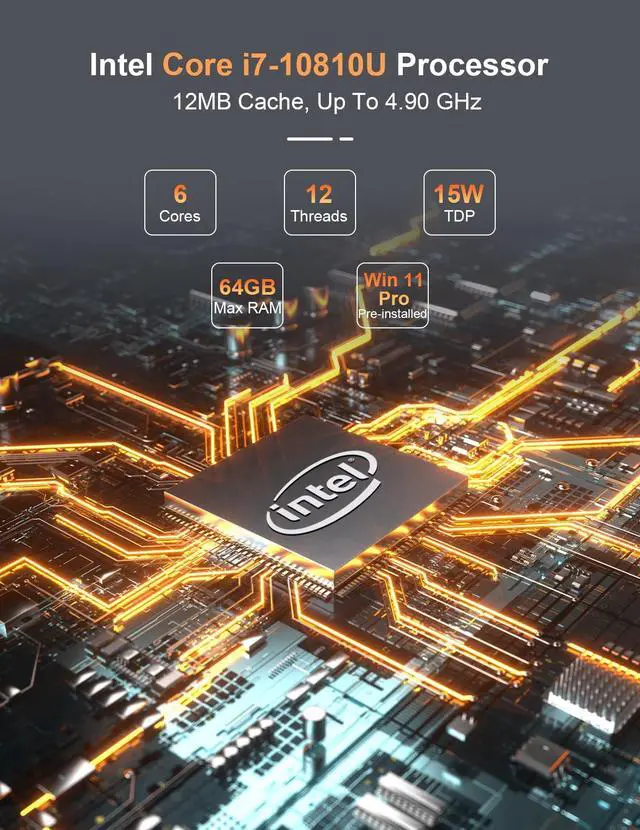 Efficient and Stable 10th CPUBAH6 industrial PC is equipped with Core i7-10810U processor, basic frequency 1.10 GHz (up to 4.90 GHz), 6 cores and 12 threads, 12MB smart cache, faster and more stable operation. The Mini PC is pre-installed with Win 11 Pro and supports the installation of Win 10 and Linux operating systems. It allows you to easily cope with industrial automation control, commercial intelligent terminals, public service facilities and other scenarios. ^^ High Capacity & ExpandableThis mini industrial computer is equipped with 2 DDR4 SO-DIMM memory slots (expandable up to 64GB), which allows the mini pc to run multiple high-performance operations simultaneously.