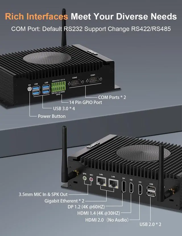 BT 4.2 can be used to connect computer peripherals, and 4 USB 3.0 ports provide 5Gbps high-speed data transmission. ^^ Rich Interfaces and MultifunctionBaieyu mini industrial pc has 1*HD 2.0, 1*HD 1.4, 1*DP, 4*USB 3.0, 2*USB 2.0, 2*RJ45 LAN, 14-pin GPIO, 2*RS232 COM (can be changed to RS422/485), 1*SPK, 1*MIC, 1*DC ports, easy to connect keyboard, mouse, printer and other external devices. Mini desktop PC supports multiple functions such as Auto Power On, LAN wake-up, RTC wake-up and PXE boot. It has dual Gigabit Ethernet ports, Therefore firewall functionality is also supported.