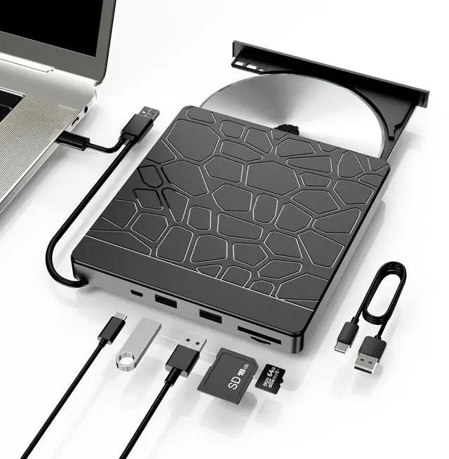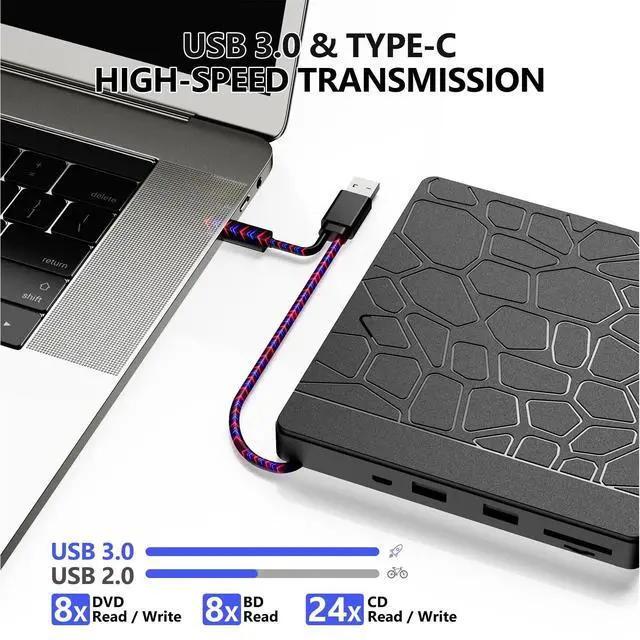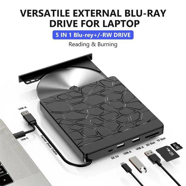 Drive for Laptop: This 5-in-1 device doubles as a Blu-ray player for PC with 2 extra USB-A 3.0 ports, SD/TF card readers, and CD/DVD burning capabilities all in one compact and portable design ^^ Experience advanced Blu-ray playback with 6X Blu-ray, 8X DVD, and 24X CD read speeds. Efficient and energy-saving operation for smooth CD/DVD burning. (Blu-ray burning not supported) ^^ Benefit from 24/7 expert support for Blu-ray playback, connectivity, or software issues. Easily resolve problems via order messaging. (Not compatible with TVs, Tablets, Smartphones, PS4, iPads, Surface Pro, Chromebooks, Projectors, Cars, and Windows 98. )