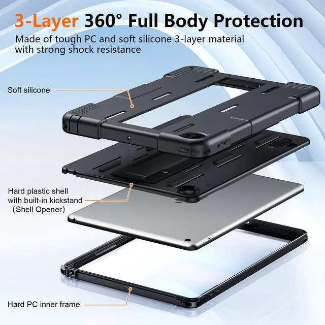 (Note: Please check all of the plugs are sealed before using underwater) ^^ Invisible Kickstand & Elastic Hand Strap & Portable Shoulder StrapSturdy built-in kickstand easy to push out and back in, provides multi-angle viewing, offering a pretty convenient use experience for film watching, working, typing and Studying. The Elastic Hand Strap helps you hold your iPad 9th/8th/7th gen easily, with portable shoulder strap allows you to carry your iPad conveniently, You can even hang it behind the headrest of your car seat or anywhere you want ^^ Full Body 3-Layer ProtectionFlexible outer silicone with hard PC inner shell and top PC frame providing full body protection for your iPad, prevent from drops, shocks, bumps, scratches and dirt. No worry your iPad would slip out of your kids' hands and break. Full access to all ports, buttons and cameras without removing the case ^^ Customer Service Product may be occasionally damaged during transportation, please feel free to us if you receive defective items or have any issues, we will reply to you within 24 hours