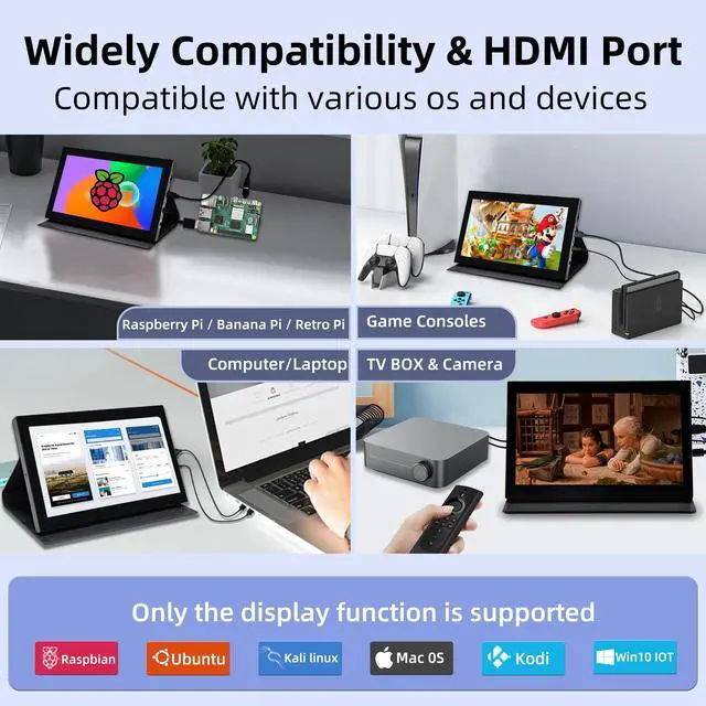iPitBit 7 inch monitor offers a resolution of 1024x600. Its IPS panel provides a wide 178 viewing angle, and flicker-free technology effectively reduces eye fatigue. ^^ The high-sensitivity 5-point capacitive touch screen monitor is plug-and-play, requiring no additional drivers. Simply connect the device via the HDMI interface and power it via the USB interface to enable the touch function, with a response time of only 3-5 ms. ^^ iPitBit 7-inch portable display is suitable for various versions of Raspberry Pi and multiple devices such as Octo Pi, Banana Pi, Retro Pi, game consoles, computers, and TV boxes.