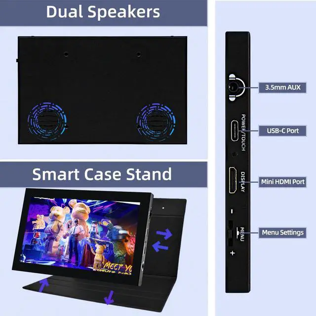 It supports multiple systems including Retro Pi, NOOBS, Debian, Ubuntu, Kodi, and Windows 7/8/10/11. ^^ This versatile small HDMI monitor features built-in speakers and a stylish ultra-thin design. It comes with a foldable PU case that protects the screen, it is lightweight and portable for work and travel. Equipped with mounting holes on the back, it can easily install VESA bracket. ^^ You will get 7 inch Monitor x 1, HDMI to HDMI Cable x 1, USB-C Cable x 1, and Micro-HDMI Adapter x 1.