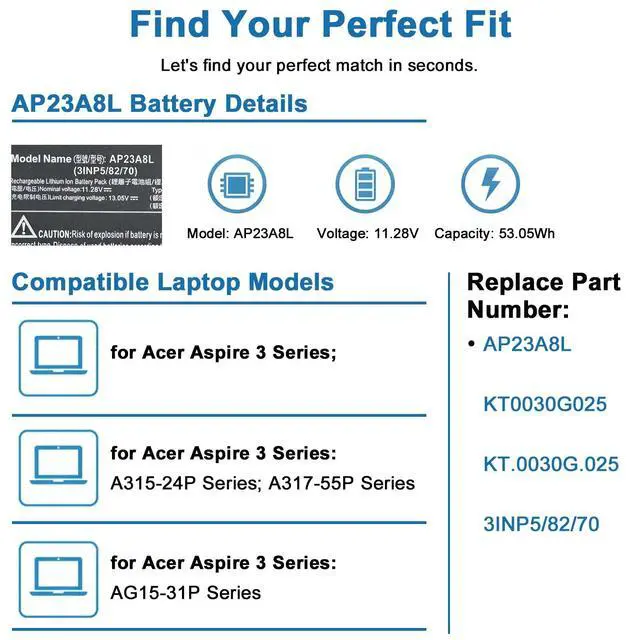 WHAT YOU GET: 1 * AP23A8L battery. 1 * User Manual. 4 * Screwdrivers. ^^ Compatible with AP23A8L battery. Fit for Acer Aspire 3 AG15-31P Series; Fit for Acer Aspire 3 A317-55P Series; Fit for Acer Aspire 3 A315-24P Series ^^ Part Number AP23A8L KT0030G025 KT. 0030G. 025 3INP5/82/70 ^^ Outstanding quality All HPXXDJA products have passed CE and UL safety certifications. Each battery has the capacity to provide enduring, continual use. Fully Safeguard your laptop and batteries.