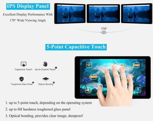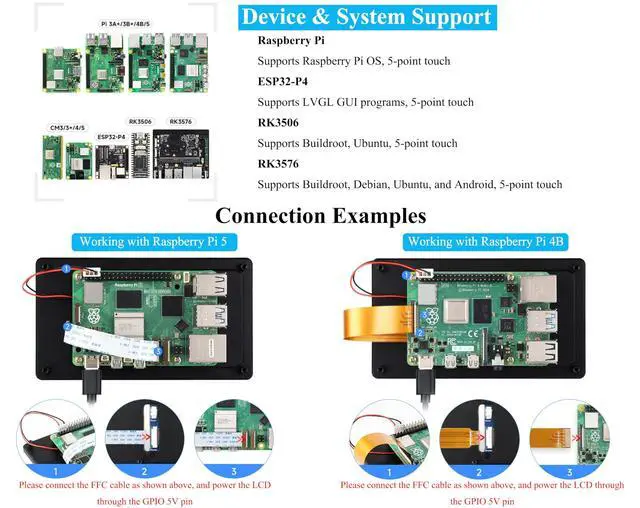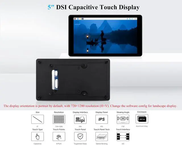 5inch DSI touch screen, 5-point capacitive touch control. IPS display panel with hardware resolution of 7201280. Aluminum alloy back cover design, pure passive cooling design. ^^ Compatible with Raspberry Pi 5/4B/3B+/3A+/CM5/CM4 /CM3+/ ESP32-P4, RK3506, RK3576, etc. ^^ Optical bonding toughened glass panel, clearer picture quality. Toughened glass capacitive touch panel, hardness up to 6H. ^^ Drive the LCD through the DSI interface, with a refresh rate of up to 60Hz. ^^ Supports software control of backlight brightness. ^^ Comes with Online Development Resources and Tutorials to help you get started quickly: bit. ly/4lhb8G2