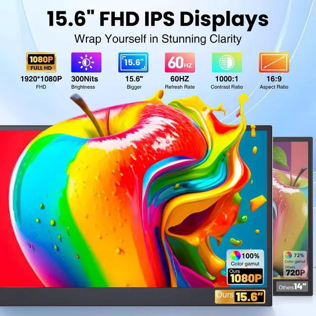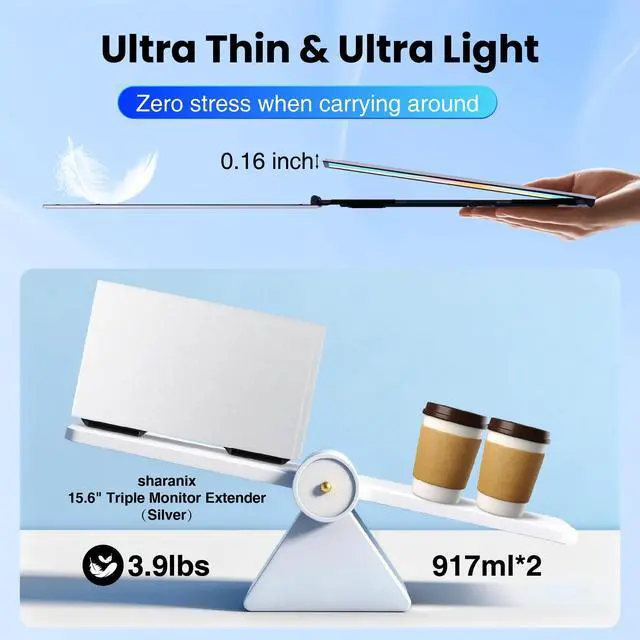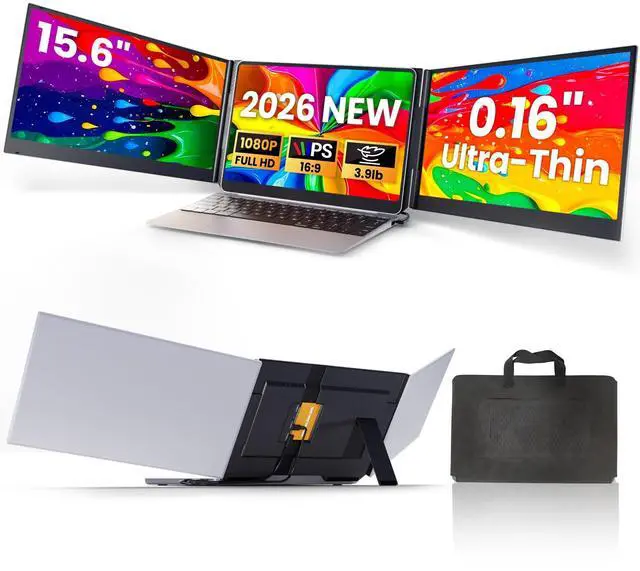 Ultra Slim & LightweightEngineered for ultimate mobility, Sharanix upgraded triple screen laptop monitor extender weighs just 3.9 lbs (as light as two coffee mugs) and with a 0.16" ultra-thin screen. It's one of the lightest and slimmest 15.6" triple laptop screen extender on the market, boasting exceptional portability. The included custom-fit carrying case lets you effortlessly slide it into your backpackperfect for travel, remote work, or on-the-go productivity. ^^ 15.6" FHD IPS Dual Screen, Stunning Visual ExperienceSharanix laptop monitor extender features two 15.6" FHD 1080P IPS displays with 300 nits brightness, 1000:1 contrast ratio and 100% sRGB color.