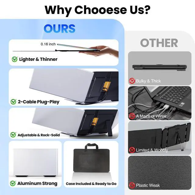 Backed by a reliable warranty, its robust design lets you work with full confidence anywhere. ^^ Complete Accessories & Reliable ServiceEverything you need for instant laptop screen extender setup is included: 1* screen extender, 1* bag, 2* USB-C to USB-C, 1* USB-A to USB-C, 1* HD to TYPE-C, 1* H5-T. No extra purchases requiredget productive right away! 24-hour professional customer service provides timely solutions for all your using questions.