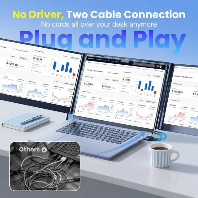 It delivers vivid, true-to-life visuals with ultra-wide viewing angles for an immersive experience. Built-in blue light filter & anti-glare technology effectively reduces eye strain, perfect for prolonged use and heavy data processing. It supports 180 rotation, so you can adjust it to a shared or private angle at any time. ^^ 2 Cables Plug & Play, Wide CompatibilitySharanix portable monitor for laptop features 2-cable plug and play setupno driver installation required for instant use. Compatible with 13-17" laptops and all mainstream systems: Windows, macOS, Chrome OS, Android, Linux. This triple monitor for laptop also supports connection to smartphones and devices with an HDMI output port (such as desktop computers, laptops, mini PCs, set-top boxes, game consoles, etc. ) ^^ 300% Efficiency Boost, Tidy WorkstationTransform your laptop into a 3-screen workstation with mirror/extend/presentation modessay goodbye to cluttered windows and desktops. This multiple screens for laptop can helps you realize seamless multitasking, boost work efficiency up to 300% and save valuable time & space. The newly upgraded 60cm cable provides the perfect length to organize your cables and keep your desktop tidy. Perfect for IT professionals, stock traders, programmers, gamers and all high-efficiency seekers. ^^ High Quality & Reassuring DesignPremium silver aluminum alloy casing, featuring a unique fingerprint-resistant designmore sturdy, durable, and stylish than ordinary black dual screen monitor for laptop, maintaining a like-new appearance even with prolonged use. The adjustable telescopic stand offers a secure, custom fit for 13- 17.3" laptops. A reinforced back bracket with non-slip rubber pads locks the laptop screen extender securely in place with zero wobble.