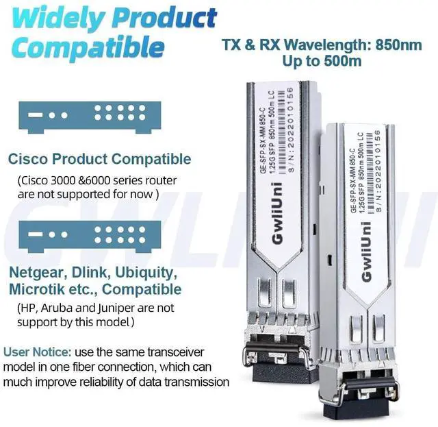 High Performance Multi-mode duplex 1.25 Gigabit SFP transceiver, supports up to 500m fiber length connection and 0~70 operating temperature. ^^ Widely Compatible The SFP transceiver are widely compatible with Cisco products(Cisco 3000 &6000 series router are not supported) and Netgear, MikroTik, Ubiquity, DLink etc., ( Not recommended for HP, Juniper and Aruba products). The fiber module also works well with switch, router, media converter and more gigabit SFP optic ports ^^ High Quality The shell adopts high density and heat-resistant insulation zinc alloy, high performance chipset, which makes the product more stable and efficient transmission, and low power consumption.