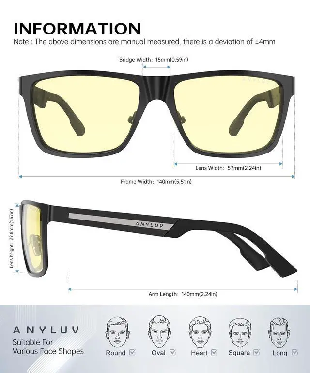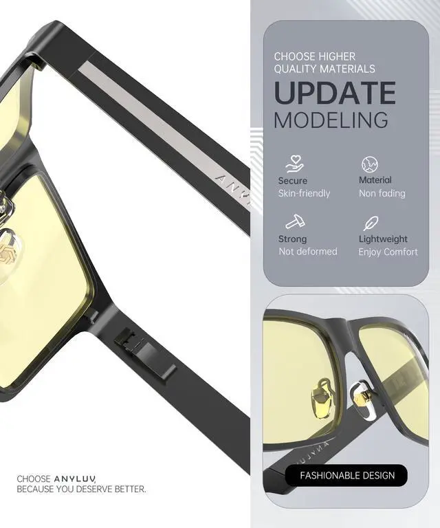 ^^ Stylish Blue Glasses: These computer glasses combine modern and classic design elements for any occasion. A low-key yet elegant design style can better highlight your temperament. The computer glasses feature square slim-fit frames and an ANYLUV logo decorative temple design, presenting a refined and fashionable style. Whether you are at work or in your daily life, men's anti-blue light glasses can add a touch of fashion to your appearance and showcase your unique charm ^^ Brand Customer Service & Gift Package: This type of blue ray glasses come with an exquisite triangular folding box, which will be a great gift for your family and friends! ANYLUV attaches great importance to product quality and customer satisfaction. Each ANYLUV customer can enjoy after-sale brand service for our blue screen glasses.