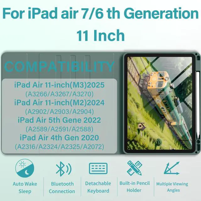 • CompatibilityThis iPad case with keyboard is designed for iPad Air 7th/6th Gen 11-inch M3/M2 (2025/2024), Model Number: A2902/AA2903/A2904, for iPad Air 5th Generation (2022), Model Number: A2588/A2589/A2591, for iPad Air 4th Generation (2020), Model Number: A2316/A2324/A2325/A2072. NOT compatible with any other iPad models. Please check the back bottom of your iPad to find the model number before placing order
